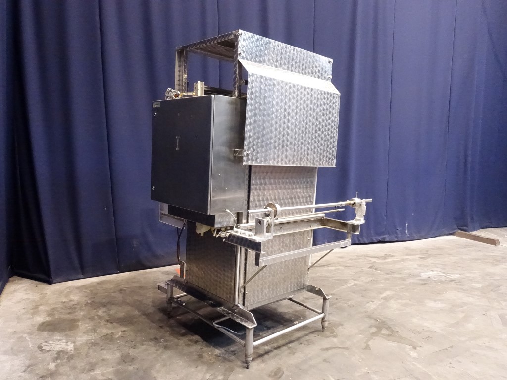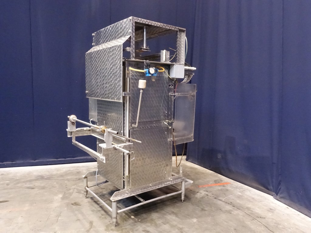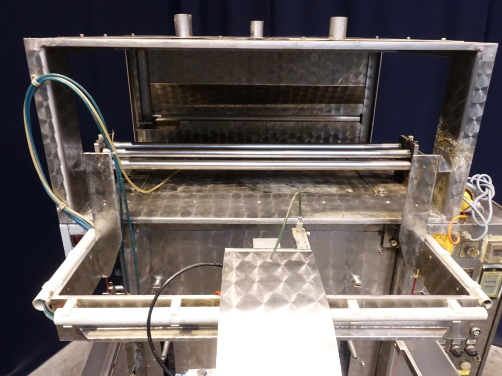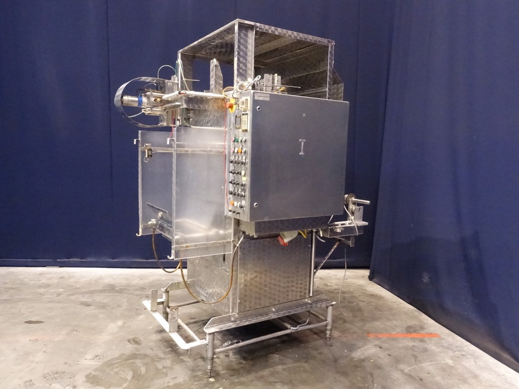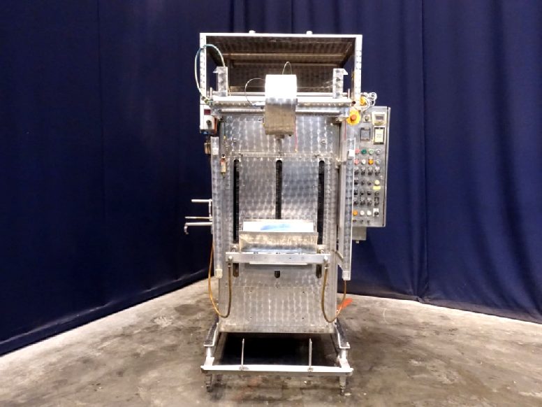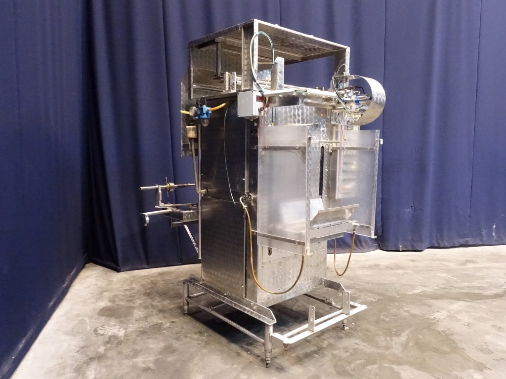 Incomplete vertical transwrap form fill seal machine. For 5 and 10ltr plastic bags, from a roll by heatsealing. Foil width approx 75 cm. nr. 8704, year: 1987. Pneumatic driven, For thin liquid products like milk or water. Time filler. CIP cleanable.