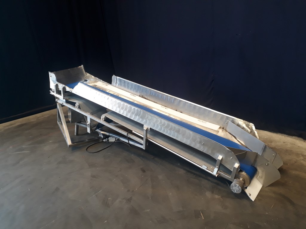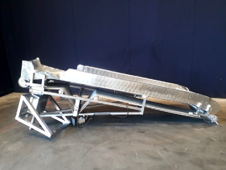 Belt conveyor with stainless steel frame. Belt width: 450 mm. Belt lenght: 3250 mm. Angle approx. 15 degree up, turnable mounted on a frame. Total dimensions: 3300 mm x 700 mm x 1300 mm.
